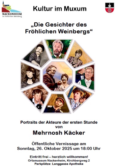 Es ist die dritte Portrait-Ausstellung der rheinhessischen Künstlerin im Nackenheimer Muxum. Mehrnosh Käcker zeigt seit Jahren ihre Arbeiten auf internationaler Bühne – und das mit großem Erfolg u.a. in Barcelona, New York und London. „Die Gesichter des 'Fröhlichen Weinbergs'“ gehört zu den Veranstaltungen des rheinhessischen Themenjahrs „Alles Carl?“ anlässlich des 100jährigen Jubiläums des