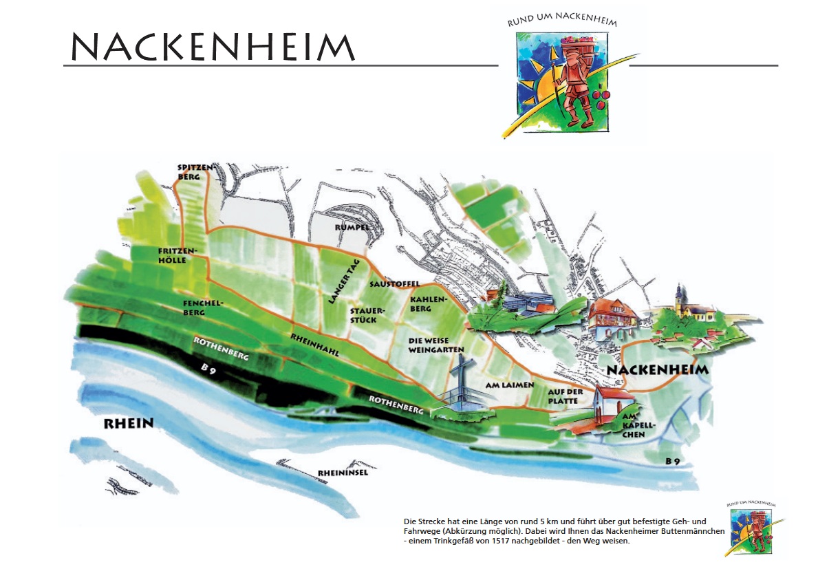 Damit man sich auf den vielen abzweigenden Wegen nicht verliert, weisen mehrere Wegweiser in Form des Buttenmännje die richtige Route durch die Weinberge. Die einzelnen Buttenmännje wurden in einer Form gegossen, die einem Trinkgefäß aus dem 16. Jahrhundert nachempfunden wurden. 20 Tafeln informieren über die Herkunft der alten Flurbezeichnungen und die örtlich angebauten Rebsorten. Ergänzt werden die Informationen durch Zitate aus den Werken Zuckmayers.