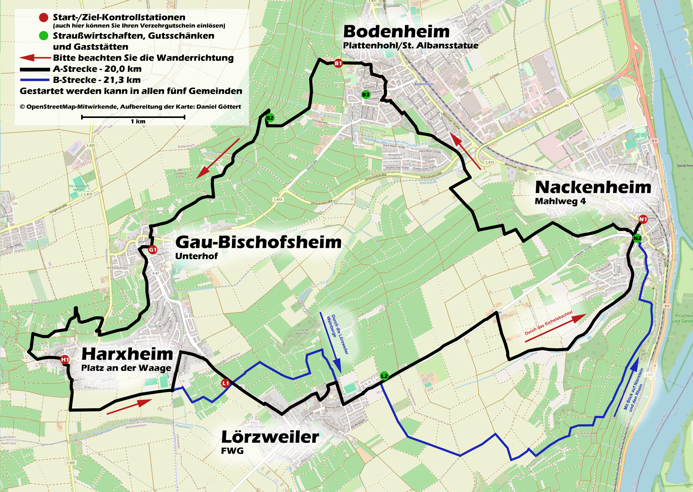 Gestartet werden kann zwischen 9:00 bis 12:00 Uhr in jeder der oben genannten Ortschaften. Starten Sie beispielsweise in Nackenheim, ist Ihr Ziel auch wieder Nackenheim, wo sie die Wanderung dann gemütlich bei einem Glas Federweißen und leckeren regionalen Spezialitäten ausklingen lassen. Von Nackenheim aus wandern sie in Richtung Bodenheim. Wählen Sie z.B. Harxheim als Start, ist ihre nächste Anlaufstelle Lörzweiler.